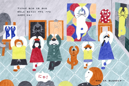 「にゃ!」の不思議な引⼒は、いろいろな⼈たちに伝染して、みんな思わず「にゃ!」。すると、インスピレーションがわいて、それぞれにユニークなものを⽣み出します。ケーキ屋さんは猫のケーキを、画家は猫を描いた⼤作を、絵本作家は『にゃ!』の絵本を、建築家は公園に猫のすべり台を……。