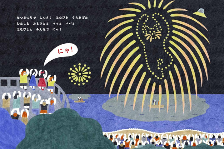 絵本『にゃ!』は、いくつもの出会いがつながり、バタフライエフェクトのように世界が変化していく様⼦をたのしく描いた⼀冊です。⾝近な誰かとも、出会ったばかりの誰かとも、ぐっと仲よくなれる「にゃ!」は、世界をつなぐ不思議な合⾔葉です。